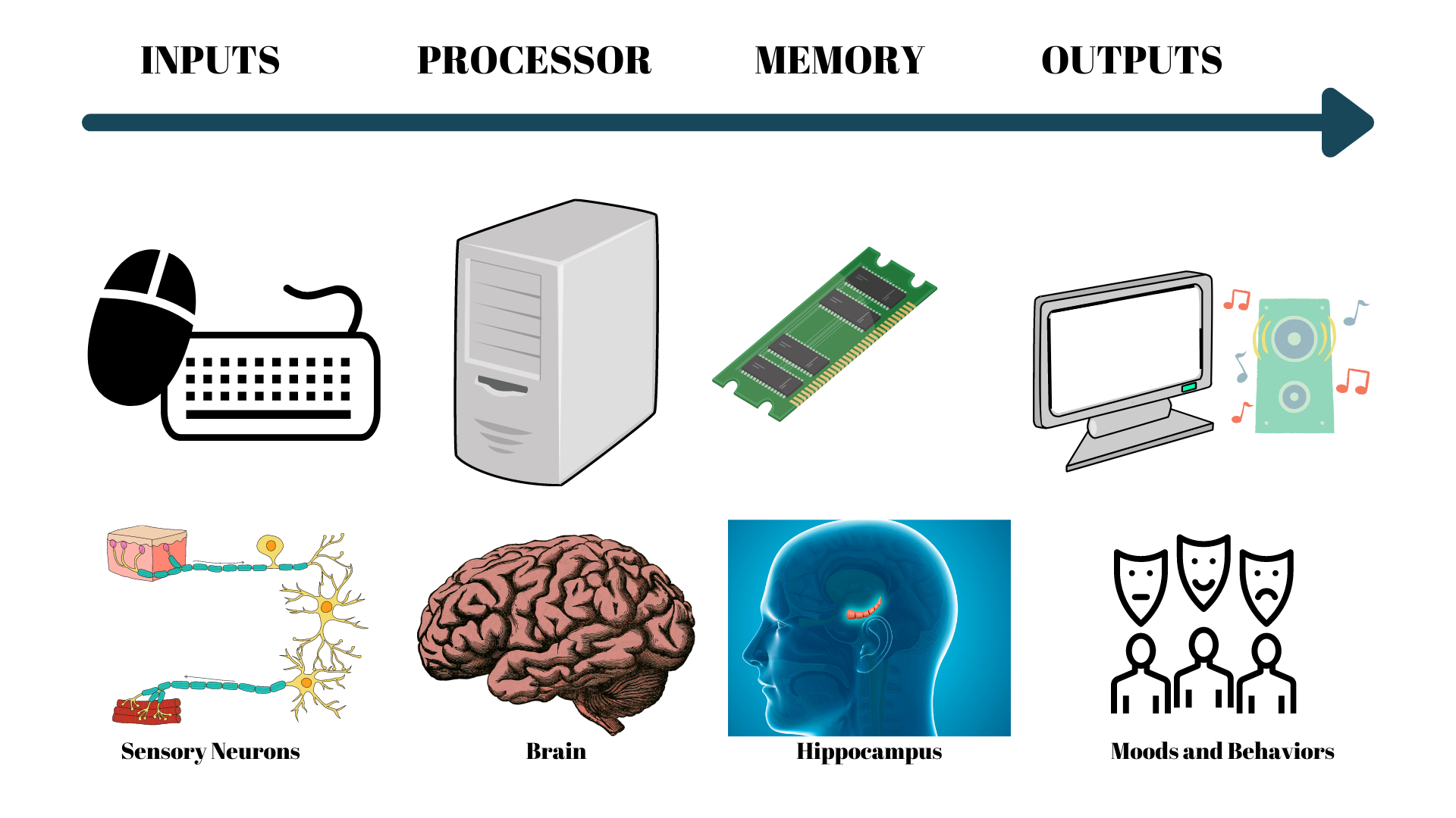 There are inputs (sensory organs), processors (brain), memory (hippocampus, cerebral cortex), and outputs (motor nerves, behaviors, moods).