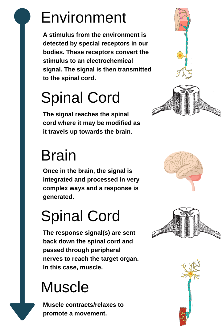 The basic pathway for producing an appropriate motor response to an environmental stimulus is diagrammed below.